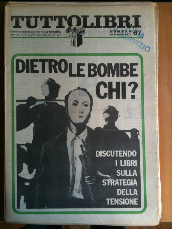 TUTTOLIBRIAnno III n^ 67 - 19 Febbraio 1977Settimanale d'informazione edito da La StampaDietro le bombe chi? - Wagner segreto - Una lettera dell'attrice sulla poesia di Pasolini Per Marilyn e la Betti20 pagine formato 30x43 cm (65 g)E2513