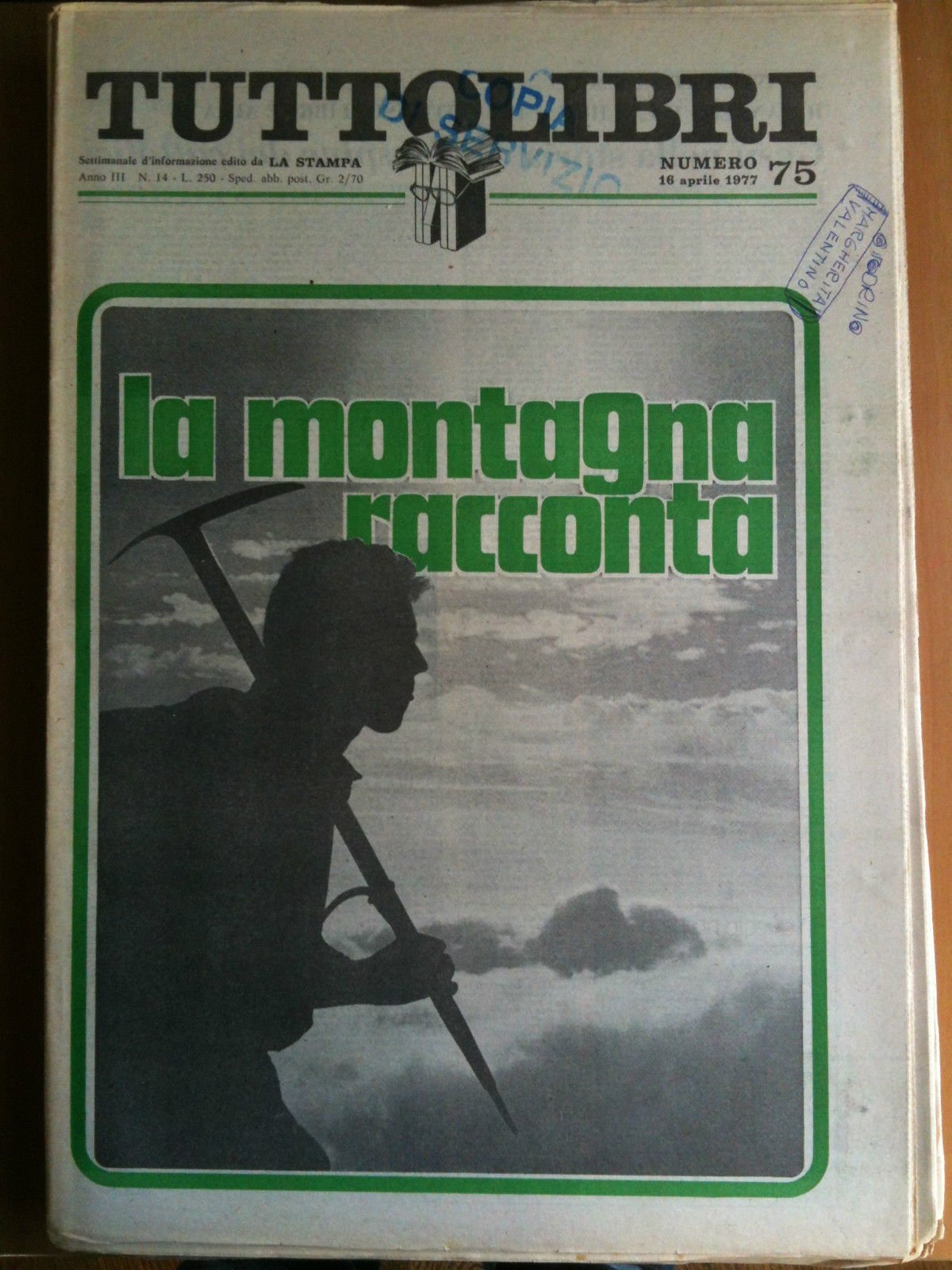 TUTTOLIBRIAnno III n^ 75 - 16 Aprile 1977Settimanale d'informazione edito da La StampaLa montagna racconta - Gesù nella storia - Per Edipo contro Freud - Francesco Petrarca autore latino - Le sinfonie di Valeri - Le confessioni di Paul Verlaine Il poeta barbone20 pagine formato 30x43 cm (65 g)E2521