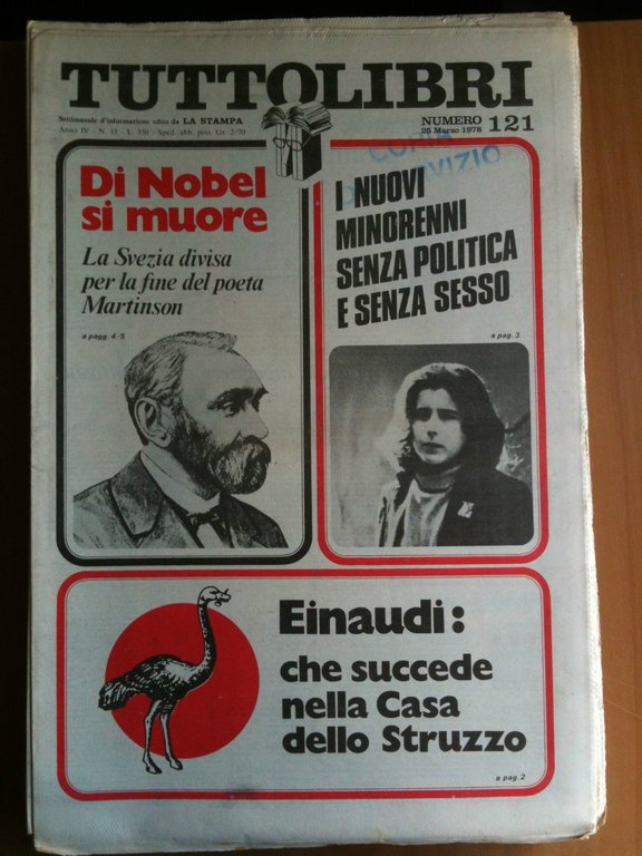 TUTTOLIBRIAnno IV n^ 121 - 25 Marzo 1978Settimanale d'informazione edito da La StampaLa Svezia divisa per la fine del poeta Martinson - Wilcock, ingegnere della fantasia - Perchè Marco Polo inventò l'Oriente - Campanella la poesia come pietra - I malumori di Savinio - l'infinito di Emily chiuso in una stanza 24 pagine formato 30x43 cm (75 g)E2565