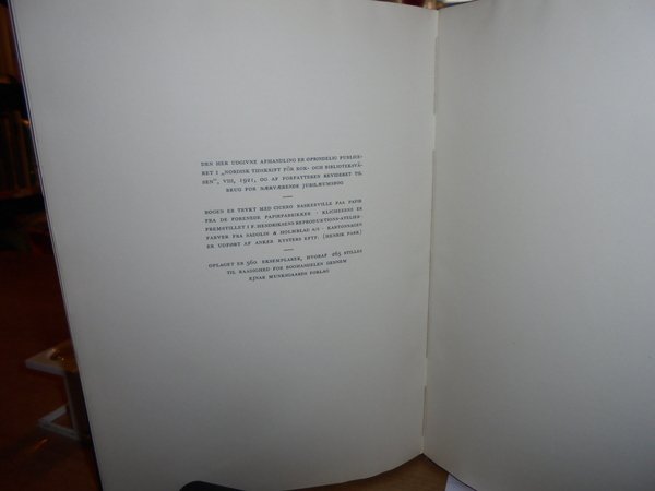 LAURITZ, NIELSEN. Kobenhavn, Vald. Pedersens Bogtrykkeri, 1946. TYCHO BRAHES BOGTRYKKERI. En Bibliografisk-boghistorisk Undersogelse. In-8°, cartonato edit. con titolo al dorso (leggermente sbiadito), impressioni in ovale dorate sui piani. 78 pp. con alcune tavole la maggior parte a colori fuori testo. Ottimo esemplare. Uff. D - III - 1