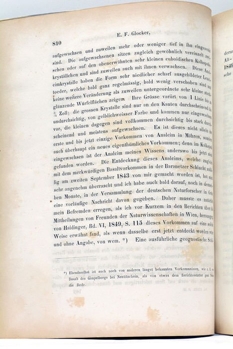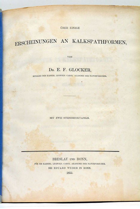 1 feuillet. 28 pages. (26,5x22 Cm). Broché. Couverture muette postérieure. Mémoire du minéralogiste allemand, professeur à l'Université de Breslau, Ernst Frierich Glocker. Tiré à part très rare, avec un titre séparé,illustré de 2 belles planches cristallographiques lithographiées. Rousseurs. Papier un peu bruni.