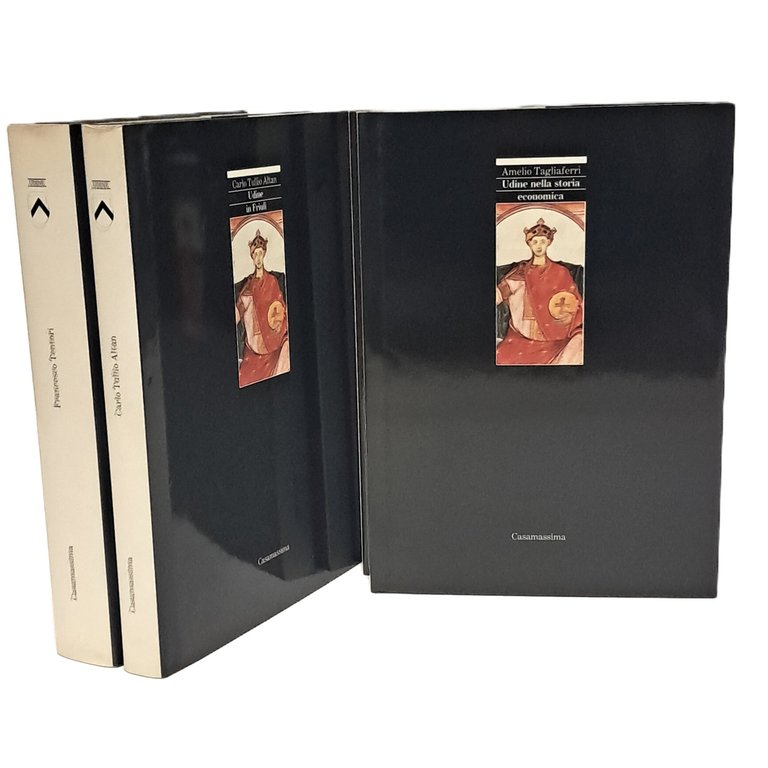 PRIMA EDIZIONE, edita in occasione del millenario della città di Udine, il 1983, cofanetto che contiene cinque volumi: Francesco Tentori, Udine: mille anni di sviluppo urbano; Tullio Altan Carlo, Udine in Friuli; Gioseffi Decio, Udine: le arti; Francescato Giuseppe, Udine: la lingua; Tagliaferri Amelio, Udine nella storia economica. Opera in cinque volumi e cofanetto. Ogni volume viene dedicato a un aspetto diverso della città di Udine e i testi sono scritti da specialisti. Tentori Francesco, Mille anni di sviluppo urbano: Sull'origine del tessuto insediativo friulano; Dal castello alla villa: fonti per la storia di Udine fino al secolo XIV; Trasformazioni sociali e territoriali dei secoli XII e XIII; Trasformazioni locali. Realtà delle rogge e utopia del canale navigabile; La tesi dell'origine policentrica di Udine. Analisi della forma urbana; Notizie sulla città degli statuti trecenteschi, dagli statuti del 1425 e dagli Annali del Comune; Notizie sulla città dal Thesaurus Ecclesiae Aquileiensis; Lo sviluppo della città attraverso lo sviluppo delle chiese; Iconografia di Udine: XVI-XIX secolo; La ripresa dello sviluppo della città e i suoi piani regolatori del XX secolo; Su Arianesimo, controversia dei tre capitoli e costruzione del Patriarcato di Aquileia; Tavole e segue bibliografia generale, udinese e friulana; pp. 533; Carlo Tullio Altan, Introduzione alla storia della città; Udine in età patriarchina; Il Friuli sotto Venezia; La città di Udine in età veneziana; Udine sotto il dominio austriaco; Udine dopo il 1866; La grande guerra e il fascismo; Udine oggi; pp. 292; Gioseffi Decio, Udine: le arti; Arti figurative; Dalle origini al gotico internazionale; Il Rinascimento; Seicento e Settecento; L'800 e il '900; pp. 293. Francescato Giuseppe, Udine: la lingua: Profilo della storia linguistica di Udine; La varietà friulana di Udine; Le altre varietà udinese: veneto e italiano; La situazione sociolinguistica di Udine; pp. 181. Tagliaferri Amelio, Udine nella storia economica: Una città e il suo territorio: da castello a capitale della patria; Udine e la patria nel dominio veneziano; Il ruolo del credito e del Sacro Monte di Pietà nella società e nell'economia udinese; Natura e distribuzione del carico fiscale nella patria veneta. Contributo originale alla sistemazione della materia; Udine da capitale morale della patria a capitale reale del Friuli. Vitalità e continuità del processo di sviluppo economico dalla caduta della repubblica veneta ai giorni nostri; pp. 254. Copertine cartonate con sovraccoperte illustrate e cofanetto. Nuovi.