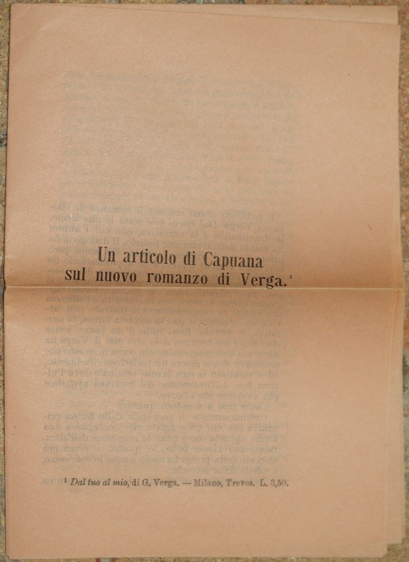 In 16. Dim. 17,5x12,5 cm. Pp. VIII. Rarissima pubblicazione, un articolo di Luigi Capuana (1839-1915) sul romanzo di Giovanni Verga (1840-1922) appena pubblicato "Dal tuo al mio". Il romanzo venne pubblicato nel 1906 quindi quest'articolo è contemporaneo. Estratto dal Giornale d'Italia. In buone condizioni. Copertina assente. Legatura assente. All'interno le pagine si presentano in ottime condizioni con rare fioriture, ancora unite fra loro. Piegatura orizzontale.Very scarce pamphlet, an article written by Luigi Capuana (1839-1915) about the novel of Giovanni Verga (1840-1922) just published "Dal tuo al mio". The novel was published in 1906 so this article is contemporary. Extract from Giornale d'Italia. In good conditions. Cover is missing. Binding is missing. Inside pages are in very good conditions with occasional foxings, still bound together. Horizontal folding.