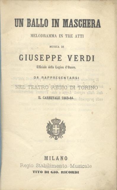 UN BALLO IN MASCHERA (1859). Melodramma in tre Atti di F.M.Piave da rappresentarsi nel Teatro Regio di Torino il Carnevale 1863-1864. Libretto d'opera. timbro a secco 1863. | Libri antichi e moderni | Verdi Giuseppe.