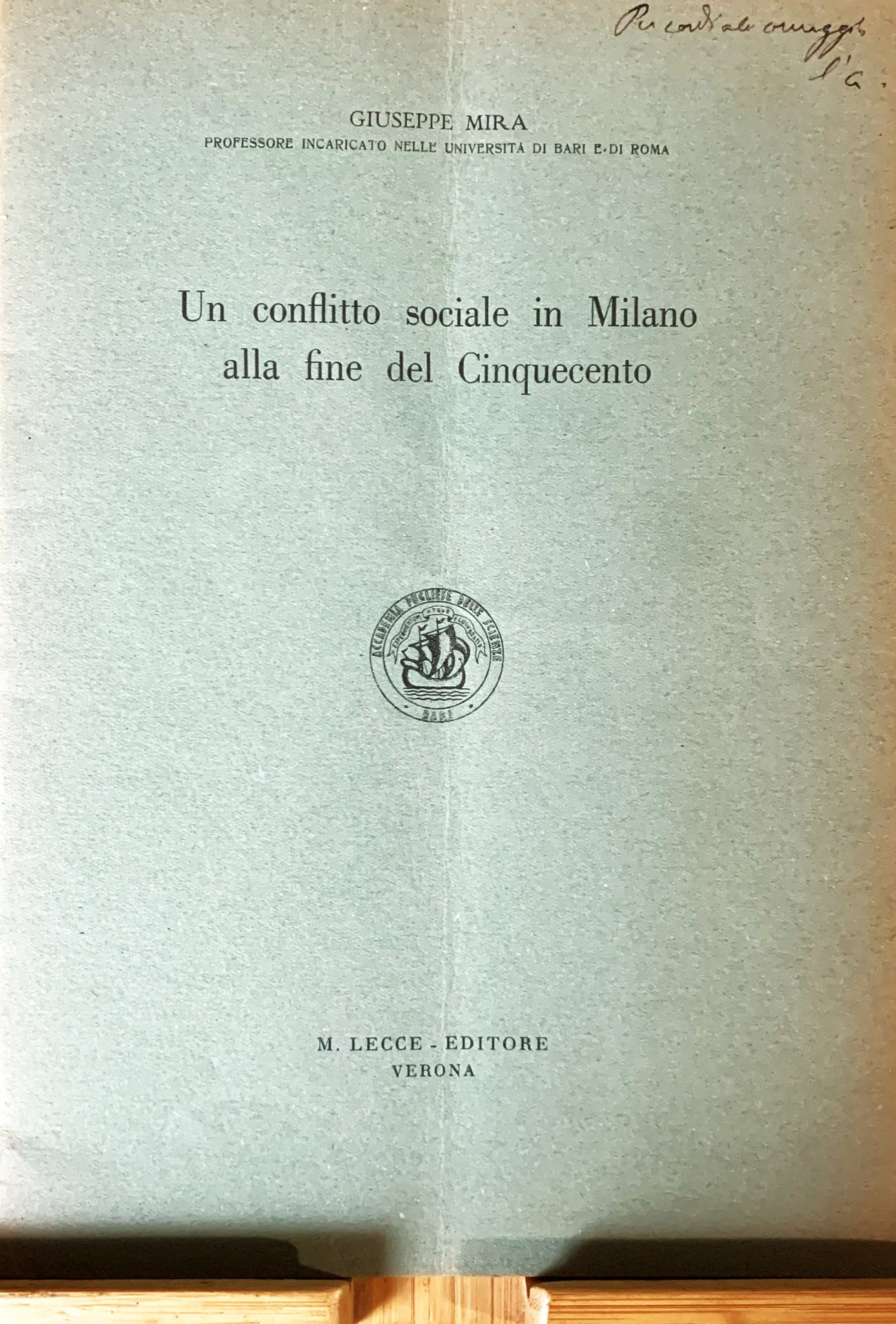 I ed.. Estratto dagli "Atti e Relazioni dell'Accademia Pugliese delle Scienze, Classe di Scienze Morali", Anno 1949. VIII/ 24/ brossura in cartoncino ruvido grigio-verde con titoli in nero, fermata con due punti metallici al dorso. Con omaggio dell'A. ad inchiostro nero al margine superiore del primo piatto. Stato buono (scoloritura della copertina ai margini e al dorso - brunitura delle pagine, in particolare ai margini - segno da piegatura mediano longitudinale che percorre tutto il volumetto, com da uso di riporlo nella tasca della giacca). Sommario: Premessa - Gli attori del conflitto - Oggetto e svolgimento del conflitto - Il significato storicco-economico del conflitto