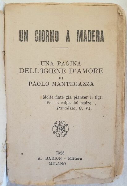 Edizione in miniatura del 1923 di questo romanzo del noto poligrafo lombardo (Monza, 1831-1910) Paolo Mantegazza. In buone condizioni. Copertina morbida moderna. Coeprtina editoriale assente. Legatura in buone condizioni. Pagine in buone condizioni con fioriture. In 24. Dim. 10x7 cm. Pp. 240. Peso Kg. 0,040 Miniature edition of 1923 of this novel by the famous poligrapher Paolo Mantegazza (Monza, 1831-1910) In good conditions. Soft modern cover. Editorial cover lacks. . Binding in good conditions. Pages are in good conditions with foxing. In 8. Dim. 19x13 cm. Pp. X+350+(2). Peso Kg. 0,040