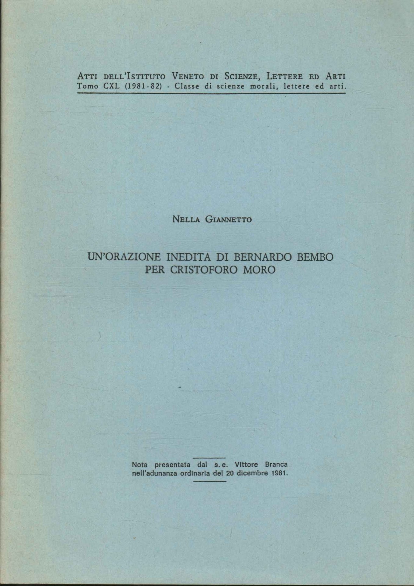 Un'orazione inedita di Bernardo Bembo per Cristoforo Moro | Libri antichi e moderni | Nella Gianetto