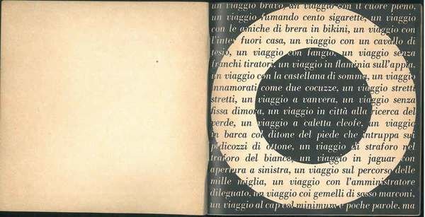 <p>15x15 cm, brochure editoriale, p. (36). Campagna pubblicitaria Pirelli del 1966. I testi di Arrigo Castellani hanno per tema il viaggio e sono stampati al recto delle pagine in contrasto chiaroscuro con le grafiche geometriche di Pino Tovaglia. Assai raro.</p>