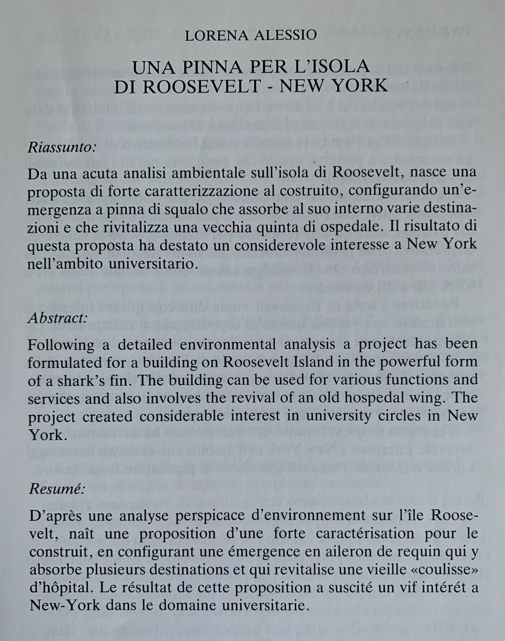 Una pinna per l'isola di Roosevelt - New York (Studi e Ricerche. Quadrimestrale del Dipartimento di scienze e tecniche per i processi di insediamento della Facoltà di Architettura del Politecnico di Torino. N. S. 37/gennaio - aprile 1993. Estratto)