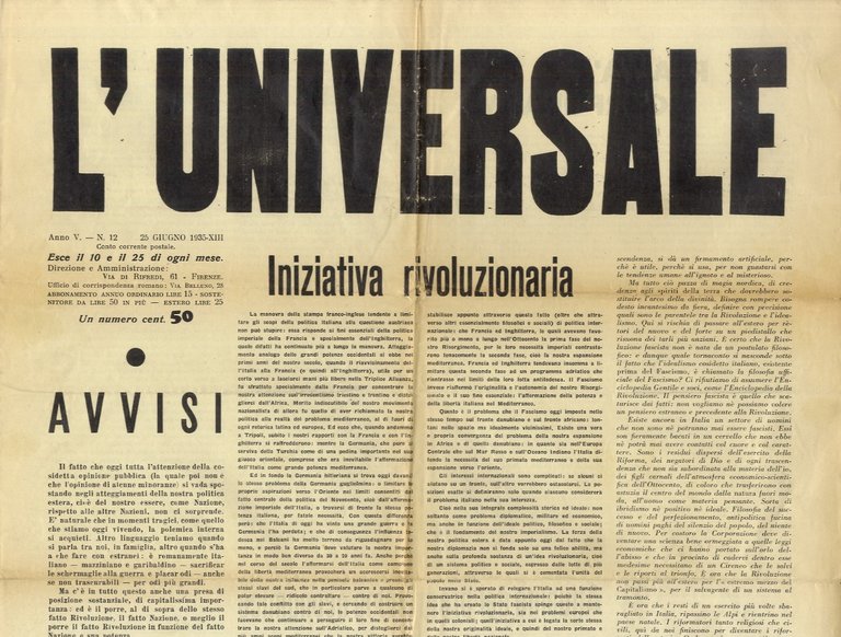 UNIVERSALE (L'). [Direttore Romano Bilenchi]. Anno V, 1935: fascicolo n. 12, 25 giugno 1935.