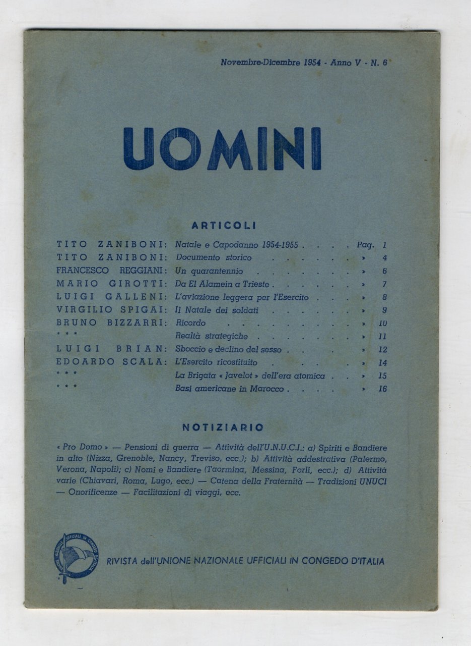 UOMINI. Rivista dell'Unione Nazionale Ufficiali in Congedo d'Italia. Di questa rivista disponiamo dei seguento numeri: anno I, 1950: n. 2 (Marzo-Aprile), n. 3 (Maggio-Giugno), n. 4 (Luglio-Agosto), n. 6 (Novembre-Dicembre). Anno II, 1951: n. 5 (Settembre-Ottobre), n. 6 (dicembre). Anno III (1952): N. 6 (Novembre-Dicembre). Anno IV (1953): nn. 1 a 6 (Gennaio-Dicembre). Anno V (1954): n. 1 (Gennaio-Febbraio), n. 5 (Settembre-Ottobre), n. 6 (Novembre-Dicembre).