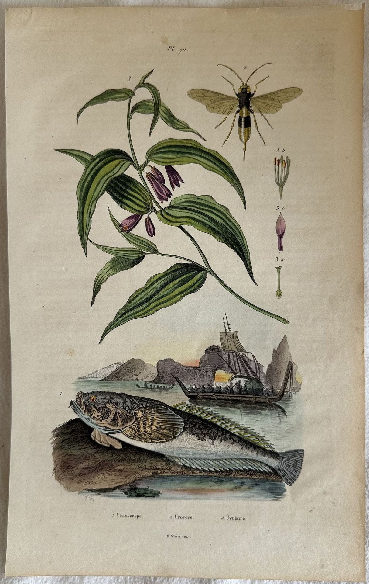 Incisione del 1839 colorata a mano che mostra un pesce prete o lucerna e la pianta Uvularia sessilifolia. Data: 1839 Autore: E. Guerin Tecnica: xilografia acquarellata a mano Dimensione del foglio: 180x285 mm Dimensione incisione: 130x220 mm Condizioni: Buone. Alcune fioriture. Nice woodcut of 1839 coloured by hand representing an atlatic stargazer and the plant Uvularia sessilifolia. Date: 1839 Author E. Guerin Technique: xilography painted by hand Size of the page: 180x285 mm Size of the engraving: 130x220 mm Conditions: Good conditions. Some foxing