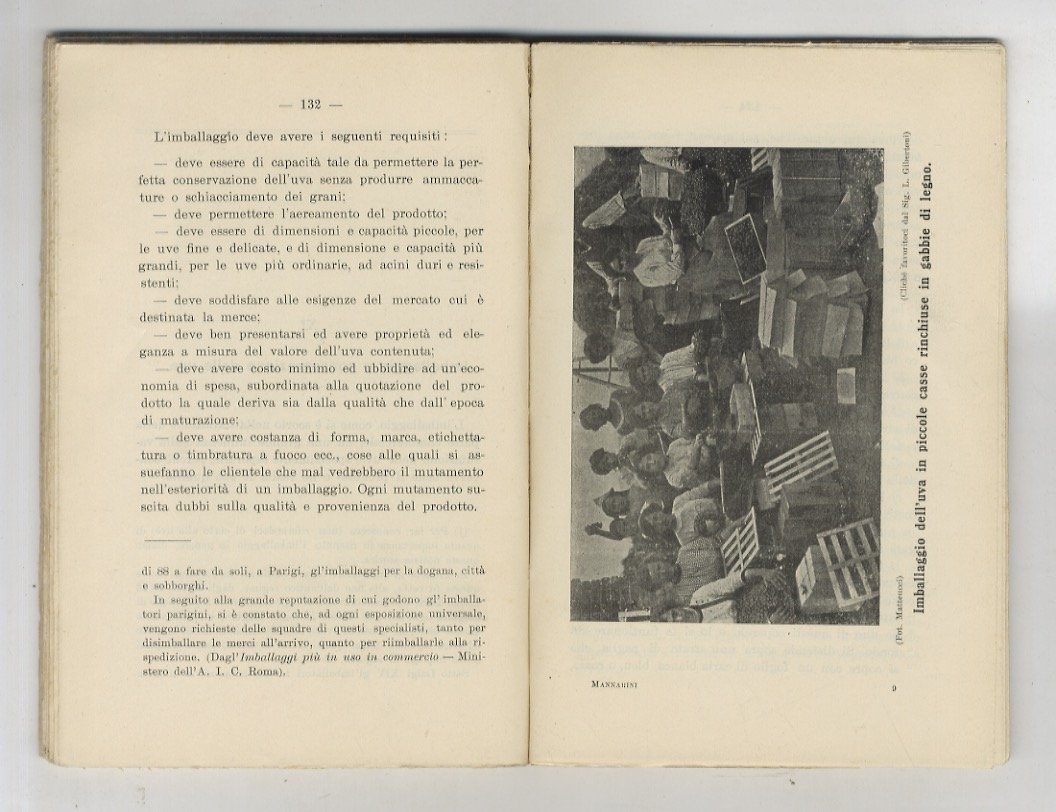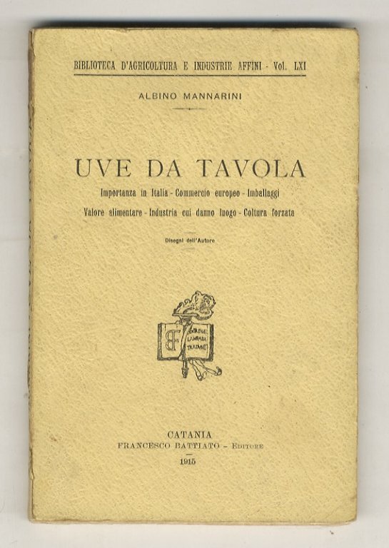 Catania, Francesco Battiato, 1915, in-16, br. editoriale, pp. 174, (4). Con 3 illustrazioni fotografiche fuori testo in b.n.(scelta, toletta e imballagggio delle uve nel comprensorio pisano) e 14 figure nel testo. "Biblioteca d'Agricoltura e Industrie affini", Vol. LXI. Dorso con mancanze, ma interno in ottimo stato.