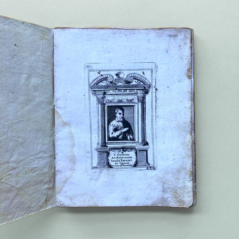 8°, cm 21, carte 52 completamente calcografico. Legatura entro cartoncino rustico, d'attesa, segni a matita al piatto anteriore. Frontespizio con ritratto del Vignola entro cornice architettonica. Al verso della prima tavola un appunto manoscritto riguardante gli ordini: toscano, dorico, ionico corintio e composito. Buon'esemplare, con piccola traccia di polvere all'angolo inferiore e una gora interna al margine bianco. Bibliografia: Cicognara, 420.. *** TUTTI I NOSTRI LIBRI SONO VISIBILI PREVIO CONTATTO MAIL O TELEFONO NELLA NUOVA SEDE DI MILANO: LIBRERIA COSMOPOLIS, VIA JOMMELLI, 22. ***