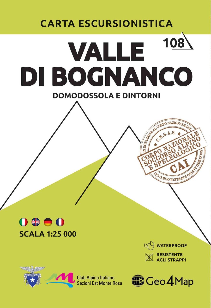 La carta escursionistica Geo4Map diValle di Bognanco n° 108 è realizzata in scala 1:25.000 con un'ampia rappresentazione del territorio di Domodossola in Val d'Ossola: formato aperto di cm. 104 x 76, formato chiuso cm 13 x 19, a colori. Stampata su carta Stone Paper, composta da polvere di pietra, è estremamente durevole, idrorepellente, anti riflesso. Le curve di livello a 20 metri, i particolari rocciosi disegnati a mano, i colori e i simboli sono solo alcune delle caratteristiche che permettono di leggere facilmente la cartografia. Nel retro sono state inserite tabelle che riportano l'elenco dei sentieri e le loro caratteristiche (numero del sentiero, punto di partenza e di arrivo, le rispettive quote, dislivello e tempo di percorrenza) nonché importanti nozioni di orientamento e primo soccorso in italiano, inglese, francese e tedesco.