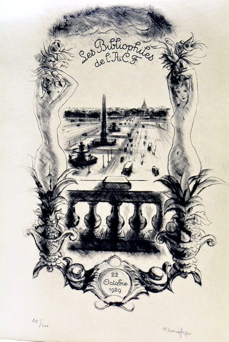 2 feuillets sous étui en carton. (29x21 Cm). 2 feuillets sous étui en carton. Très bon état. Menu du cinquiéme diner de la Compagnie, Les bubliophiles de l'A.C.G le 22 Octobre 1929. Très jolie lithografie numeroté (55/100).
