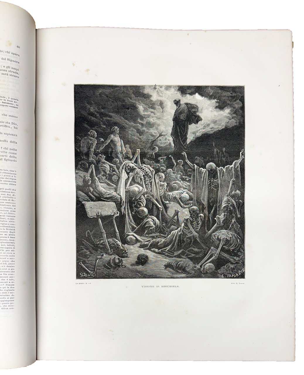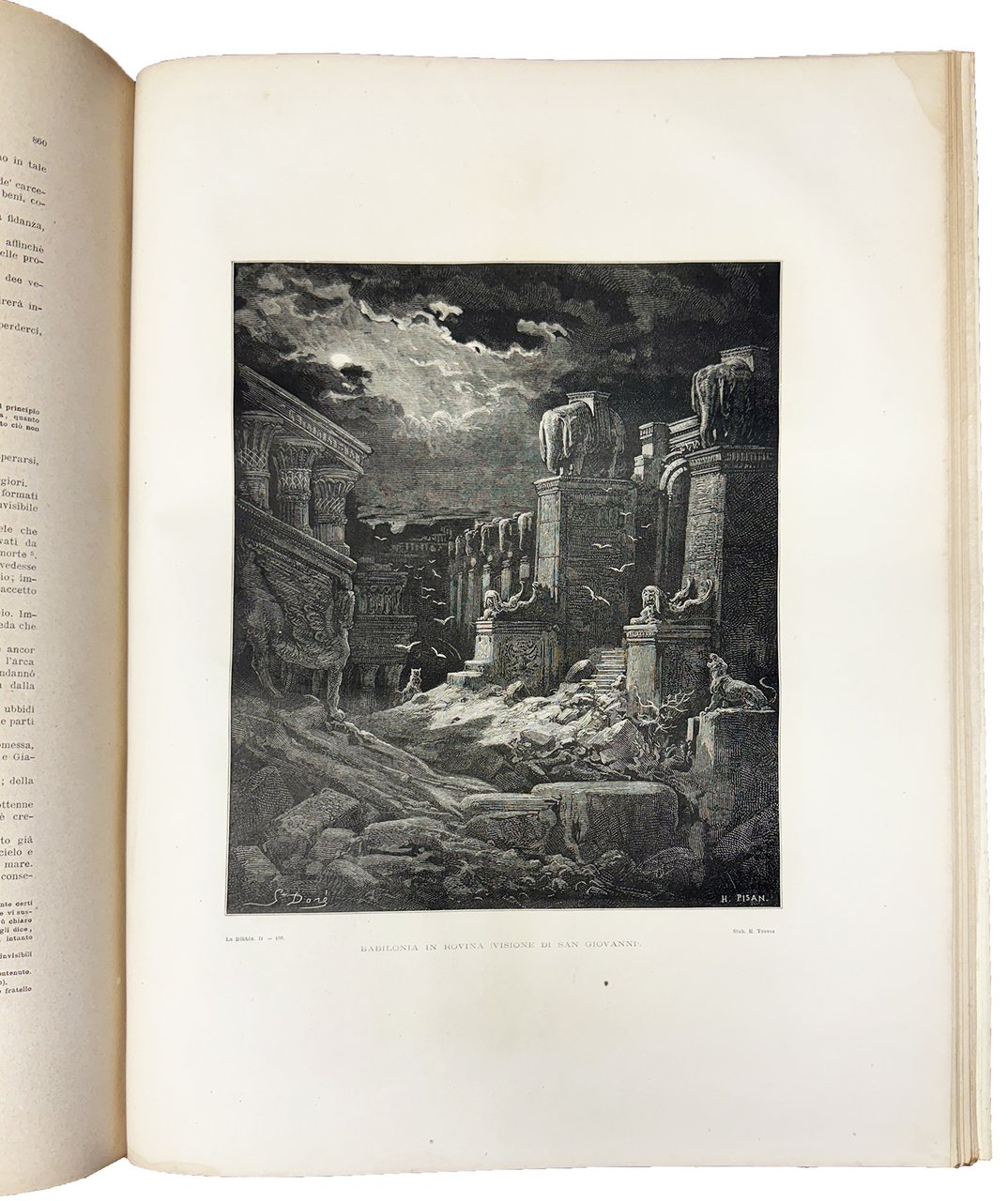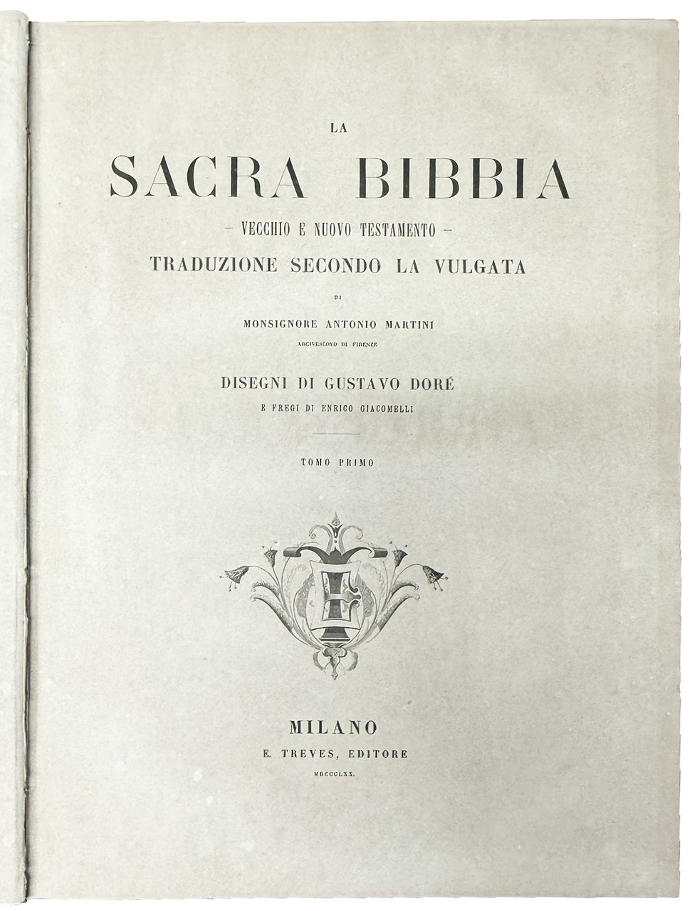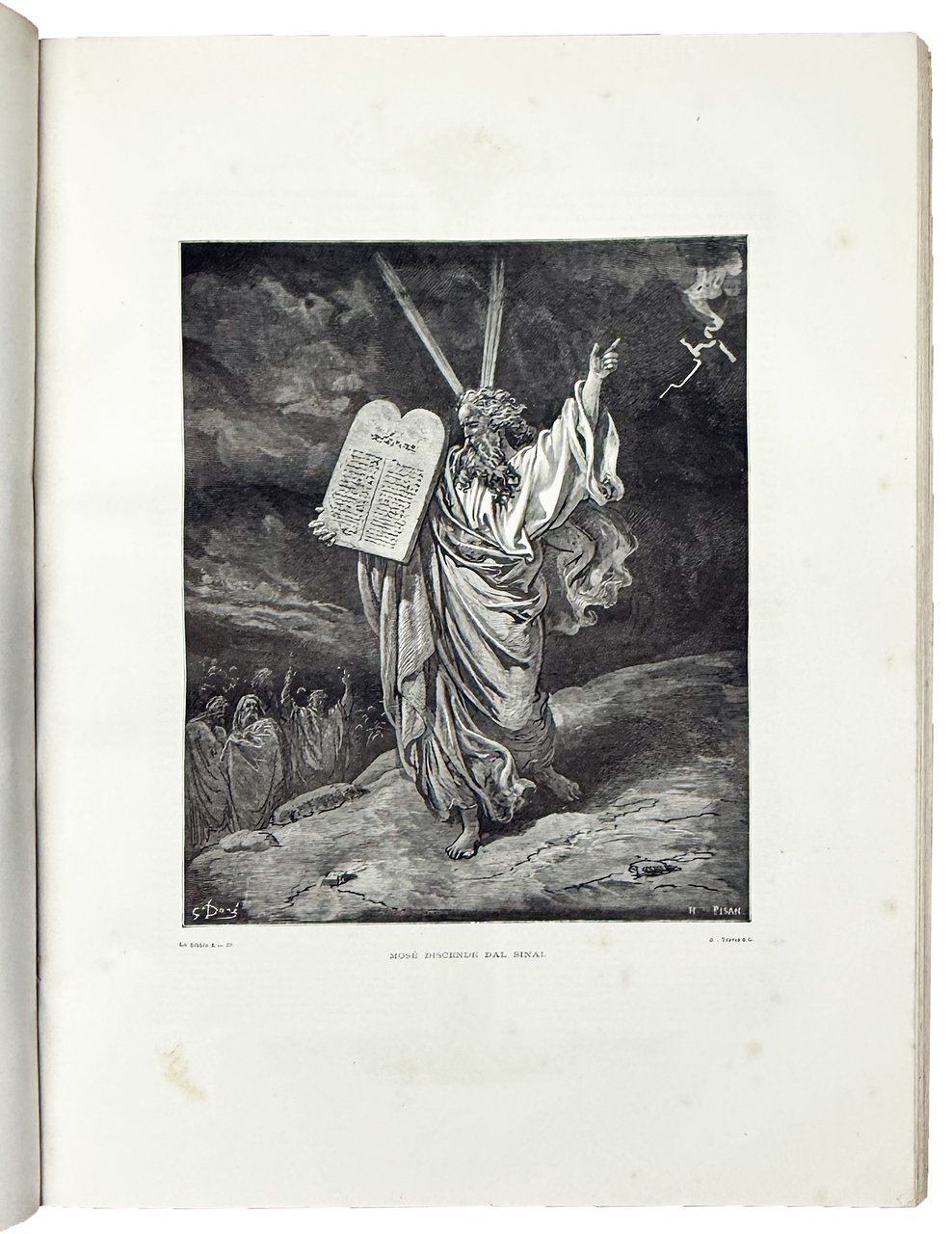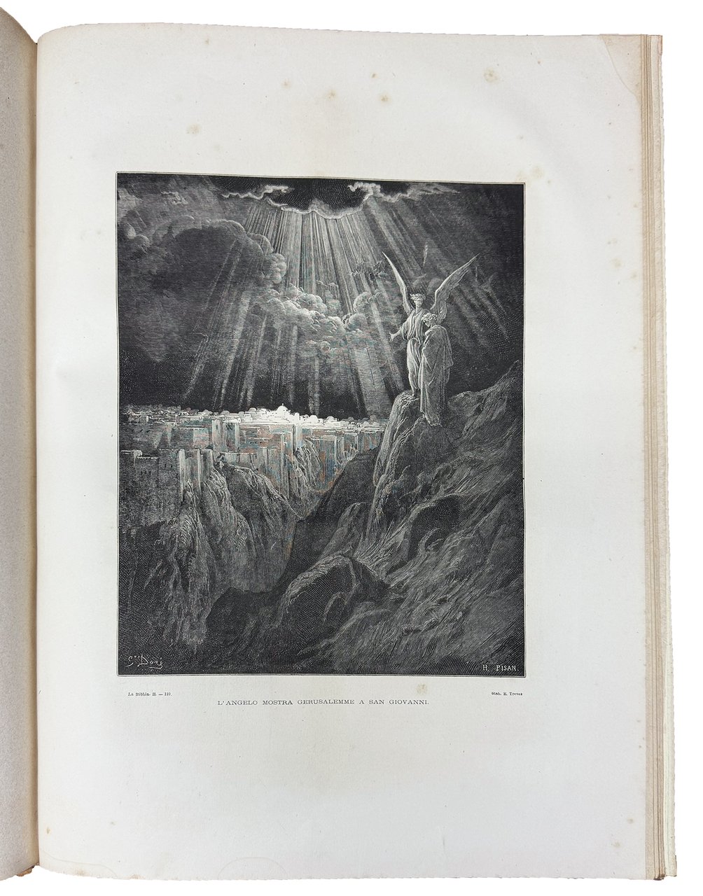 Monumentale edizione illustrata da Gustave Doré (verosimilmente seconda tiratura della prima edizione italiana con entrambe i volumi datati 1870) della classica traduzione biblica di Antonio Martini. La versione di quest'ultimo fu condotta sulla base del testo greco dei Settanta e per i raffronti con le lingue semitiche originarie l'autore si avvalse della consulenza del rabbino di Firenze, Levi. Le illustrazioni bibliche di Doré apparvero per la prima volta in Francia nel 1865. Destinate ad enorme fortuna, e tra i vertici della sua attività di incisore, influenzarono profondamente anche la percezione visiva di registi cinematografici come David W. Griffith e Cecil B. De Mille.