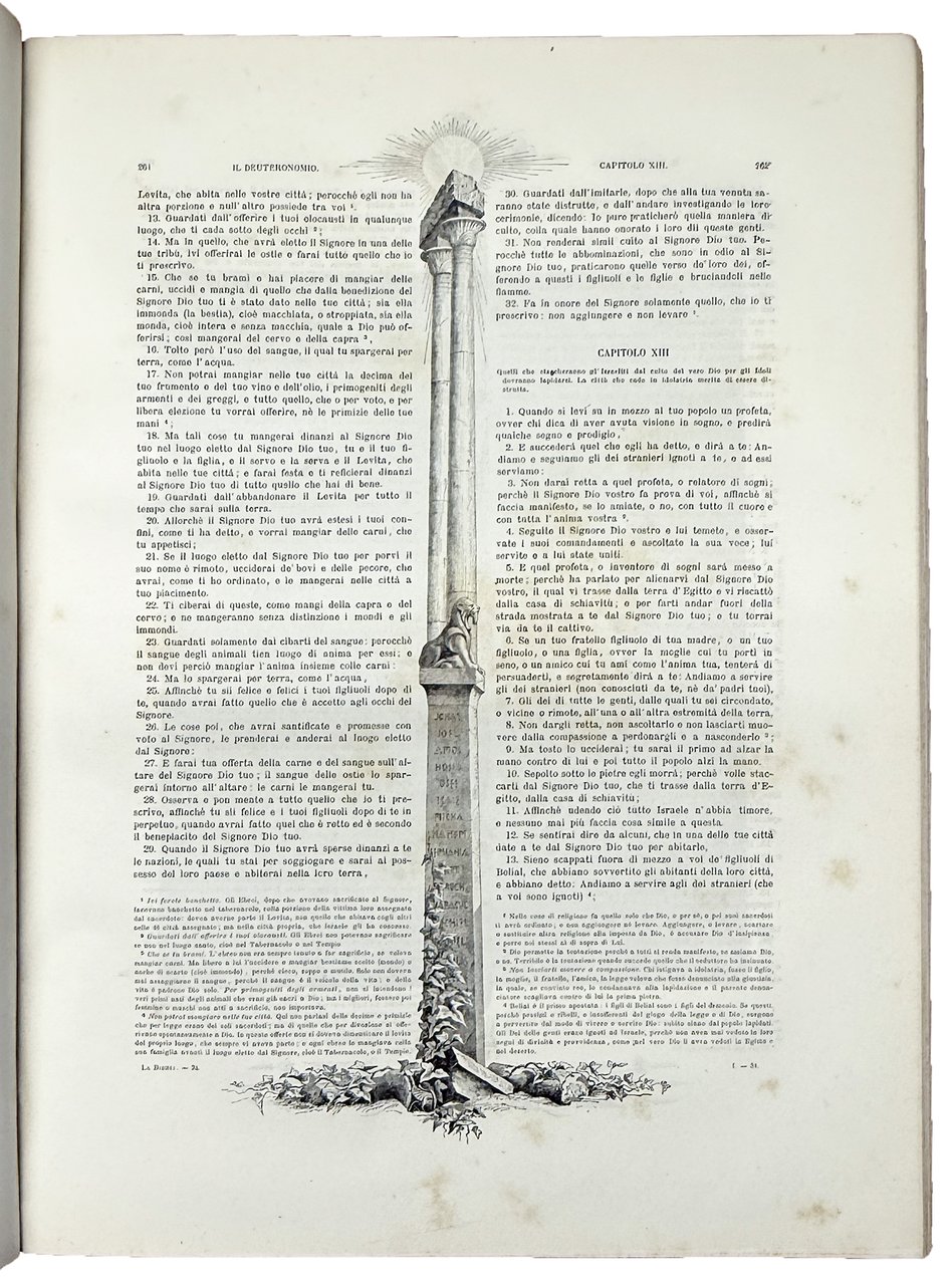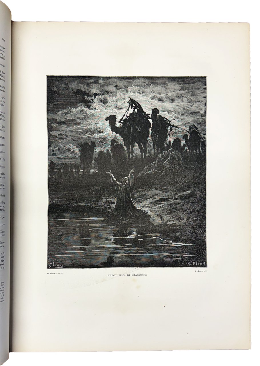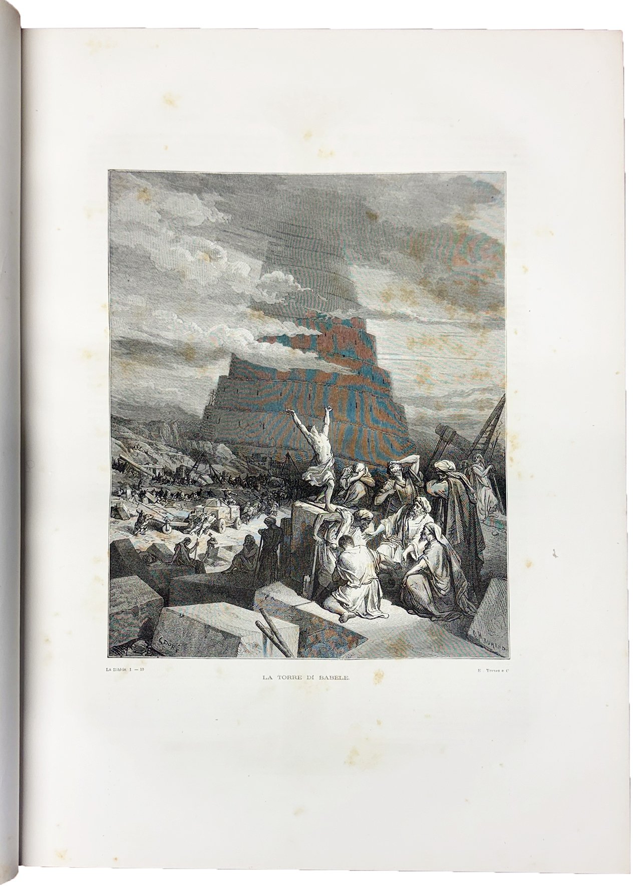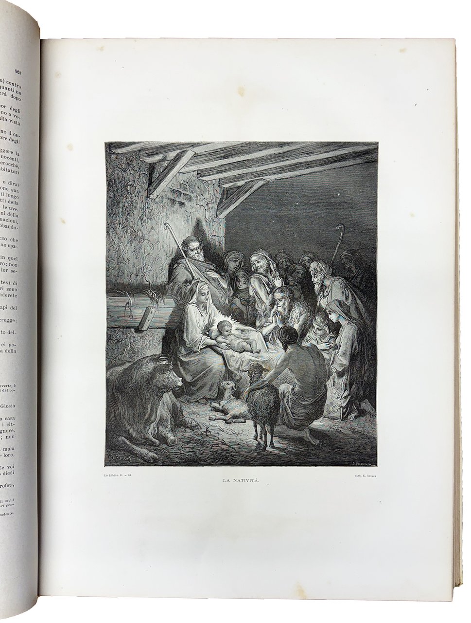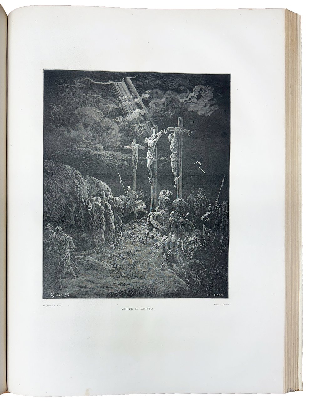 Monumentale edizione illustrata da Gustave Doré (verosimilmente seconda tiratura della prima edizione italiana con entrambe i volumi datati 1870) della classica traduzione biblica di Antonio Martini. La versione di quest'ultimo fu condotta sulla base del testo greco dei Settanta e per i raffronti con le lingue semitiche originarie l'autore si avvalse della consulenza del rabbino di Firenze, Levi. Le illustrazioni bibliche di Doré apparvero per la prima volta in Francia nel 1865. Destinate ad enorme fortuna, e tra i vertici della sua attività di incisore, influenzarono profondamente anche la percezione visiva di registi cinematografici come David W. Griffith e Cecil B. De Mille.