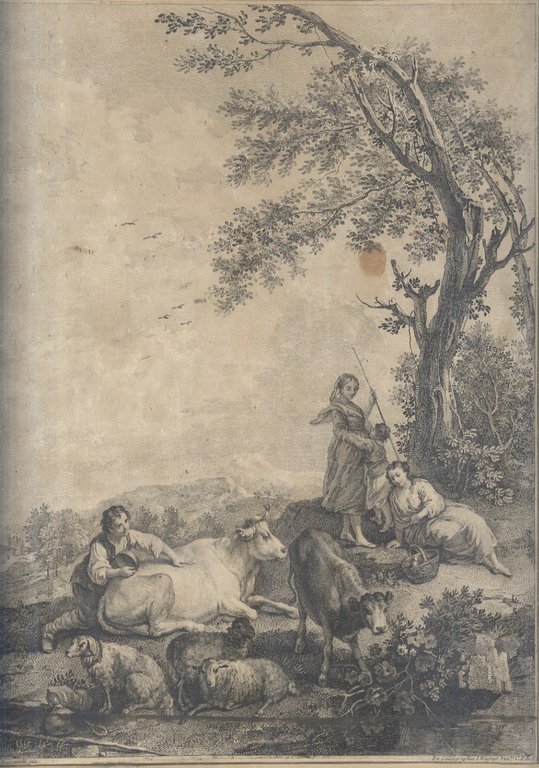 Venezia, ex Calcographia I[oseph] Wagner, [seconda metà del XVIII sec.], incisione all'acquaforte, mm. 415x310 (l'immagine al filetto di contorno), mm. 422x315 (il foglio). Firmata in lastra: a sinistra: “F. Zuccarelli pin.”; a destra: Ex Calcographia I. Wagner Ven.is C.P.E.S.”. Incisione della serie di dodici “paesaggi in verticale” incisi da Francesco Bartolozzi, pubblicati nel 1762 e derivati da invenzioni di Francesco Zuccarelli. Tiratura senza la firma di Bartolozzi in basso a sinistra. Rifilata lasciando qualche millimetro bianco oltre la cornice dell'immagine e tagliando via il testo sottostante. Una circoscritta ossidazione nello specchio inciso. Montata su cartoncino, entro passe-partout, in elegante cornice con vetro di protezione.