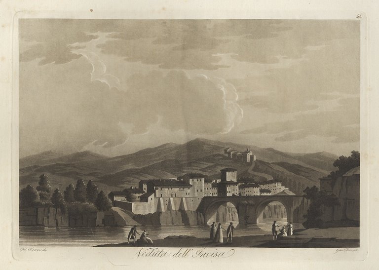 [Firenze, Tofani, 1801]. Incisione all'acquatinta in seppia di mm. 360x255 (la lastra) + ampi margini bianchi. Tratta dal "Viaggio pittorico della Toscana" di F. Fontani. Incisione di Giuseppe Pera su disegno di Antonio Terreni. Perfette condizioni.