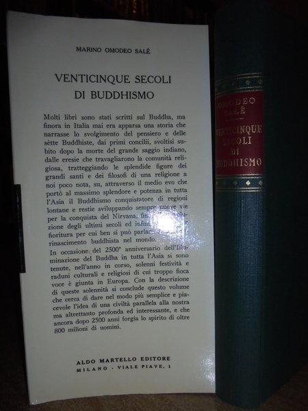 Marino, Omodeo Salé. Milano, Aldo Martello Editore, 1957. Venticinque secoli di Buddhismo. In-16° grande, tela verde con titolo in oro al dorso, sovracopertina. 227, (3) pp. con 91 tavole stampate su carta patinata fuori testo. In ottimo stato di conservazione. Neg. scat. nonno.