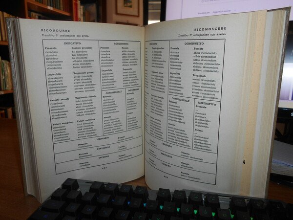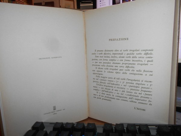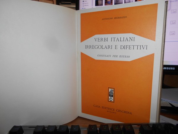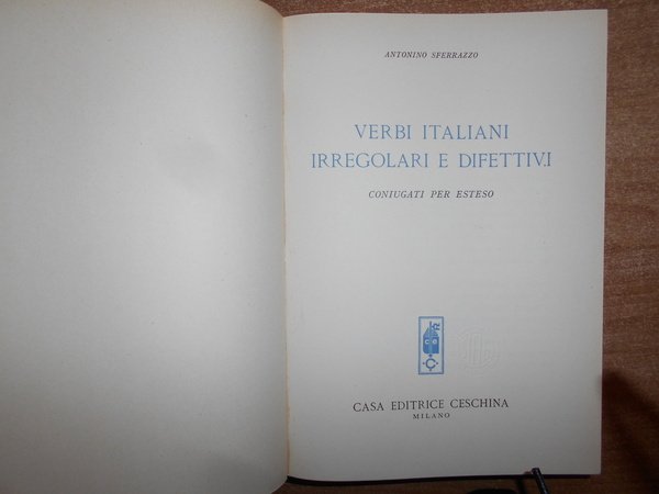 SFERRAZZO Antonino. Milano, Casa Editrice Ceschina, 1961. VERBI ITALIANI IRREGOLARI DIFETTIVI coniugati per esteso. In-8°, tela con titolo in oro entro tassello al dorso, copertine originali conservate. (ii), 632 pp. In ottimo stato di conservazione in legatura recente con le copertine originali conservate. Uff. stanzetta TV. mob. fronte nostro