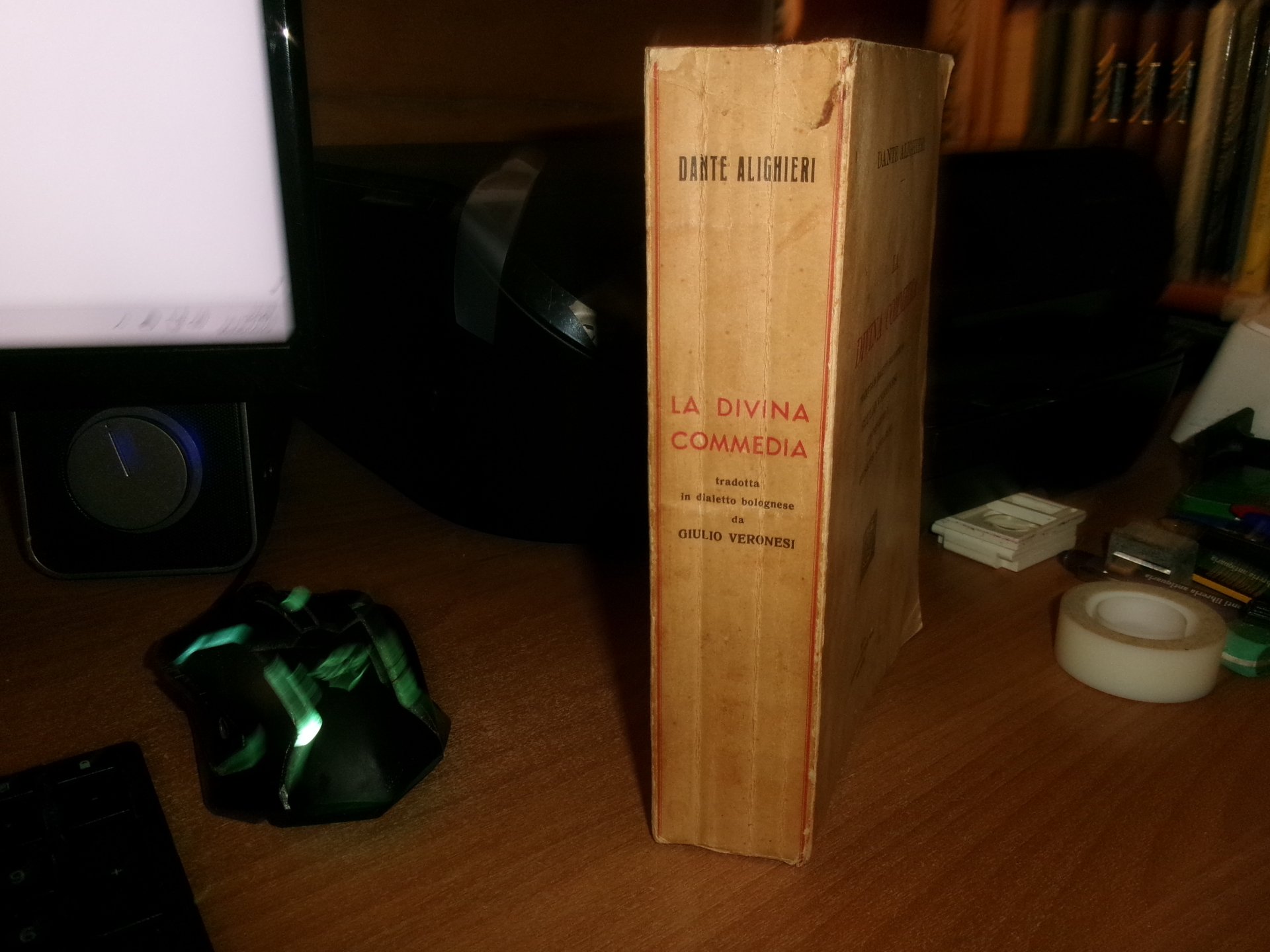 (Bologna) GIULIO VERONESI. DANTE ALIGHIERI. LA DIVINA COMMEDIA tradotta in dialetto bolognese da Giulio Veronesi con prefazione di Giuseppe Lipparini. Bologna, Tipografia Ettore Neri, 1937. In-8°, br. orig. xi, 731 pp. Normali segni del tempo ma ottimamente conservato. Rara edizione originale della traduzione in dialetto bolognese. Neg. mob. 14 basso entro busta trasp.