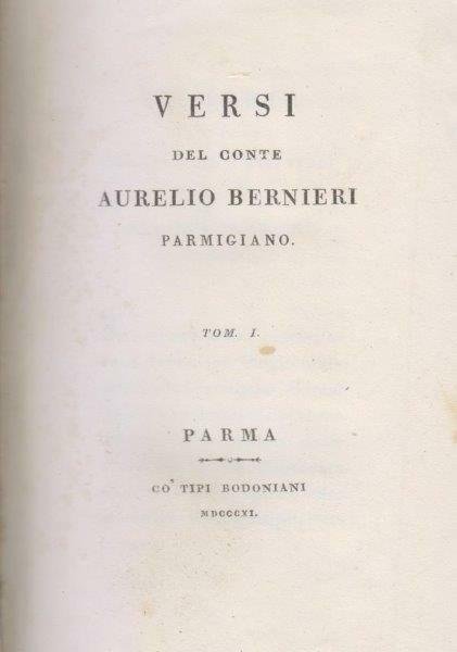 15,5 x 10,7 cm., mz.pelle ottocentesca, titoli oro al dorso, 3 volumi legati insieme, pp.(2)-L-(2)-113-(3), 130-(2), (4)-156-(2), manca la prima carta bianca del primo volume. Dopo il frontespizio si trovano le “Memorie intorno alla persona e agli studj del Conte Aurelio Bernieri” (1706-1795), scritte da Giuseppe Adorni. Brooks 1093