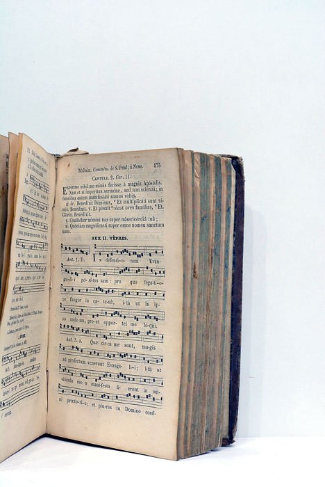 1016 pages. (18x11cm.). Plein cuir. Dos lisse doré. Coins et coiffes émoussés. 1er cahier partiellement dérelié. Salissures et défauts d'usage. Plats frottés. Notes manuscrites sur le contre-plat. Partitions de chants religieux. Rousseurs et taches. Papier bruni.