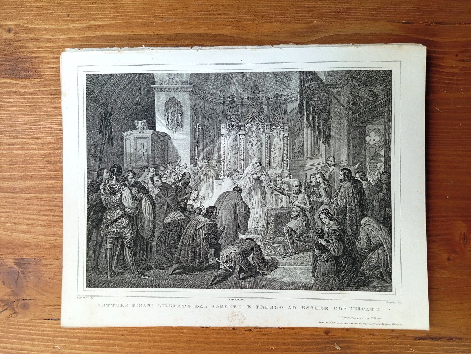 Incisione estratta dal volume "Gemme d'arti italiane - anno ottavo, 1855" (Milano, Venezia e Verona, coi tipi dello Stabilimento Nazionale di P. Ripamonti Carpano). Foglio di 20,5 x 27 cm circa; da un dipinto di Ludovico Lipparini, su disegno di Leipold; incisore Domenico Gandini. Leggere fioriture ai margini del foglio, nel complesso buono-ottimo esemplare.