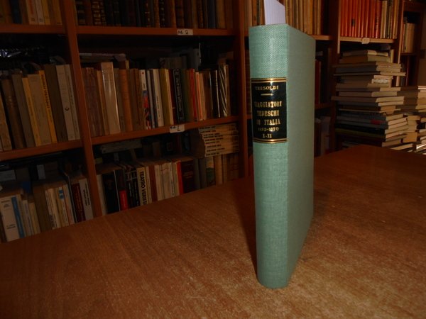LUCIA TRESOLDI. Roma, Bulzoni Editore, 1975 - 1977. Viaggiatori Tedeschi in Italia 1452-1870. Saggio bibliografico. 2 volumi legati assieme in-8°, tela verde con titolo in oro entro tassello al dorso. 82, 93 pp. con numerose illustrazioni/riproduzioni in tavole f.t. stampate su carta patinata. Come nuovo in legatura recente con tutte le copertine originali conservate. Uff. B - I - 7