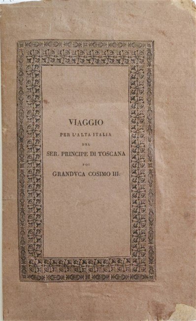 in-8, pp. VIII, 409, rileg. mod. m. perg. con tass. al d., angoli, conservate all'interno le copertine orig. Variante B senza il ritratto. Con una tav. Dettagliata descrizione del viaggio compiuto dal giovane Cosimo III de Medici presso le principali corti dell'Italia settentrionale nell'estate del 1664 a soli 22 anni, prima di essere insignito del titolo di Granduca di Toscana. Indice dei luoghi e personaggi al fine. Lozzi 5437, nota. Belliss. e fresco esempl. in barbe. [351]