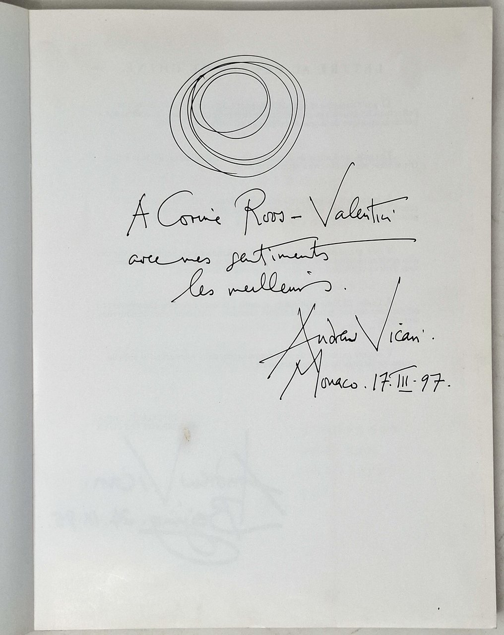Catalogo dell'esposizione Pekin, Palais des Beaux-Arts 24 septembre - 8 octobre 1995. Testo bilingue: francese e cinese. Pagine: 184. Formato: 23 x 30 cm circa. Ad impreziosire questo esemplare, sulla prima pagina bianca, è presente uno schizzo a penna dell'artista, accompagnato da una dedica e dal suo autografo (datato Monaco, 17 - III - 97). Stato di conservazione: volume con qualche minuscolo segno, appena accennate grinze (quasi sicuramente di natura editoriale) sul bordo verticale esterno delle pagine ma, nel complesso, un esemplare decisamente buono. Privo di annotazioni, sottolineature o altri segni nel testo. Copertina editoriale flessibile, illustrata a colori con un'opera del Vicari (titolata 'L'annonciade'). Numerose tavole a piena pagina a colori nel testo (con descrizione bilingue dell'opera sulla pagina frontale).