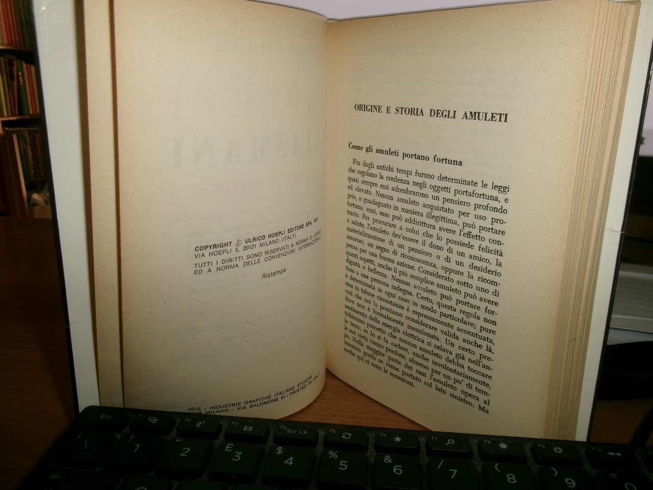 VILLIERS Elizabeth. AMULETI TALISMANI. Milano, Hoepli, 1972. In-16° grande, br. edit. ill. a col. con risvolti. 412 pp. con 23 tavole f.t. Ottimo stato. Neg. mob. 19 Hoepli.