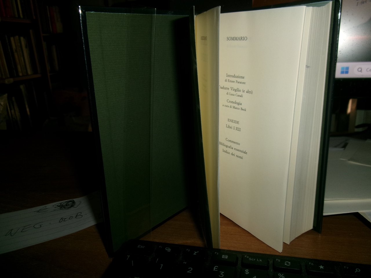 VIRGILIO. ENEIDE. Milano, Arnoldo Mondadori I Meridiani, 1989. In-16°, similpelle con sovracopertina in acetato e segnalibro in cotone. XCIII, 916, (3) pp. Ottimo stato di conservazione con astuccio. Neg. mob. M entro busta trasp.