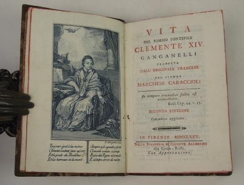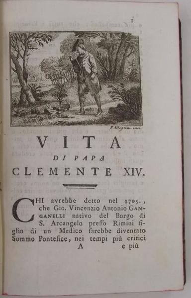 Cm. 16, pp. x, 232. Frontespizio in rosso e nero, bel ritratto del pontefice all'antiporta (stampato in tonalità di blu), una tavola fuori testo raffigurante una medaglia ed una finissima testata. Il tutto nitidamente inciso in rame. Solida legatura ottocentesca in mezza pelle con punte, dorso a nervi con titoli e fregi in oro (dorso ben rifatto). Belle sguardie in carta goffrata. Esemplare in ottimo stato di conservazione. Edizione preferibile alla prima per la qualità di stampa.