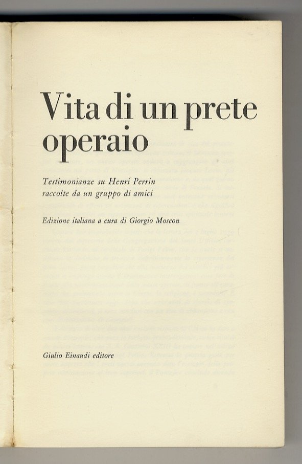 VITA di un prete operaio. Testimonianze su Henri Perrin raccolte da un gruppo di amici.Edizione italiana a cura di Giorgio Moscon.