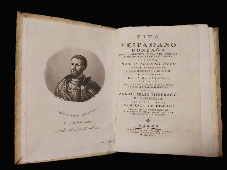 VITA DI VESPASIANO GONZAGA Duca di Sabbioneta e Trajetto, Marchese di Ostiano, Conte di Rodigo, Fondi, etc. Scritta da. Con gli Annali Ebreo-Tipografici di Sabbioneta del Signor Dottore Gianbernardo de’ Rossi.