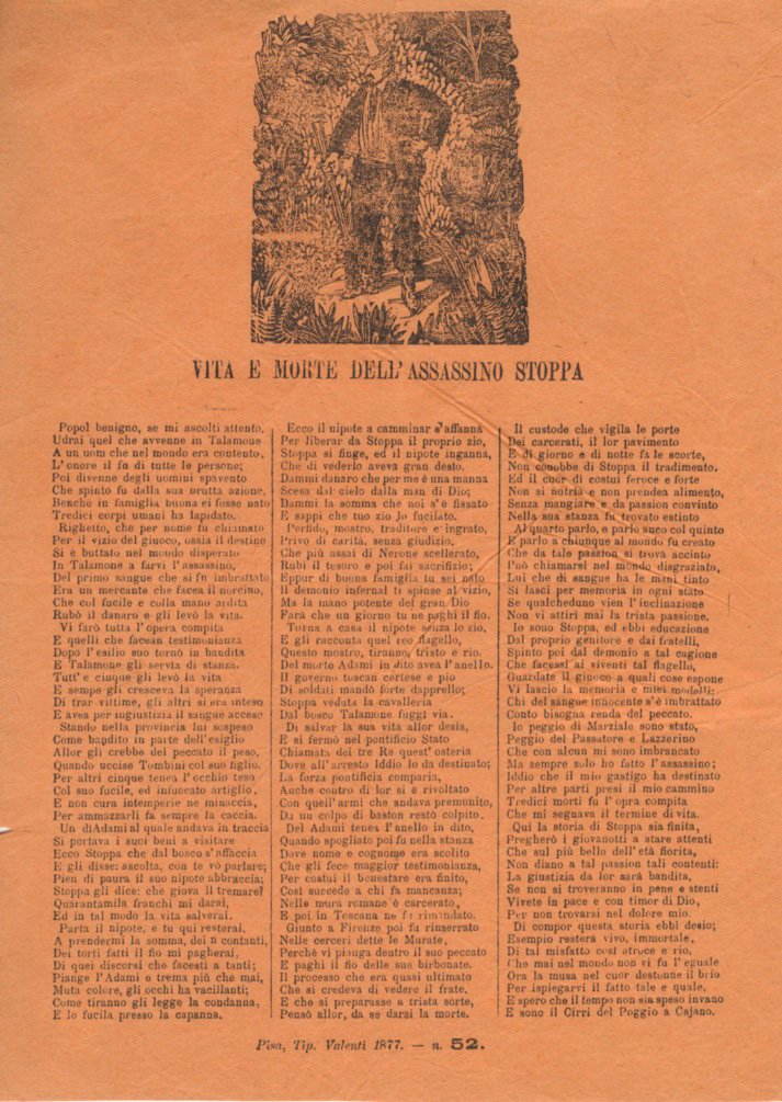 Pisa, Tip. Valenti, 1877, foglio volante in carta color rosso mattone, mm. 265x195. Xilografia raffigurante lo Stoppa in testa al documento; seguono tre colonne fitte di versi (non firmati) che ne raccontano la storia. Ottime condizioni.