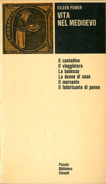 3. ed. 209 p. ; 18 x 11 m. Piccola biblioteca Einaudi. Convinta che "la storia vale in quanto è viva", Eileen Power ha voluto studiare la vita medievale nei suoi aspetti piú minuti e quotidiani, analizzando documenti piuttosto rari che testimoniano delle vicende di gente comune. Ecco, quindi, un contadino, la cui esistenza può essere delineata attraverso l'attività di una tenuta agricola dei tempi di Carlo Magno; una donna di casa, attraverso i diari di una famiglia della classe media; un fabbricante di panni, visto nella sua attività grazie a scritture e libri del tempo. Solo il commercio veneziano con l'Oriente è mostrato attraverso un grande personaggio, Marco Polo, studiato però a sua volta come uno dei tanti mercanti viaggiatori che nel Medioevo percorrevano le vie del mondo. In questo modo ci sono dati quadri vivacissimi e significativi di vita vissuta, e il racconto procede con una finezza che appassiona proprio per il suo rigore storico. Titolo originale dell'opera: «Medieval people». Traduzione di Lodovico Terzi. Brossura editoriale, coperta illustrata a colori in cartoncino flessibile plastificato lucido, titolo al piatto e al dorso. Timbro ex libris nel front., plastificazione della copera leggermente ingiallita, per il resto esemplare in buone condizioni. Codice libreria 3986.