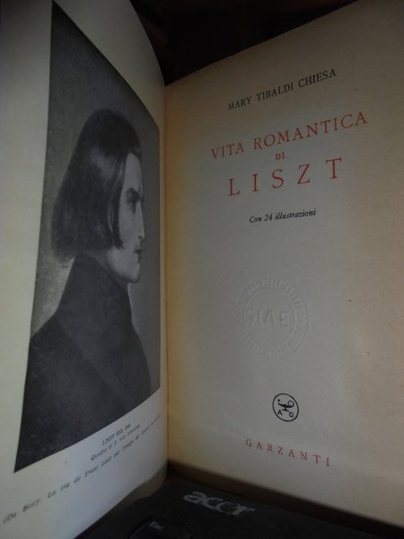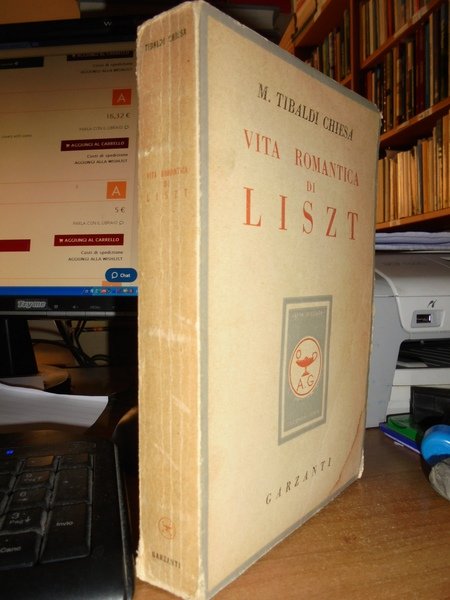 M. Tibaldi Chiesa. Milano, Garzanti, 1951. Vita romantica di LISZT. In-8°, br. orig. 421 pp. con 24 illustrazioni fuori testo. Piccolo alone angolare nella copertina, ma ben conservato. Uff. pacco F. carc.