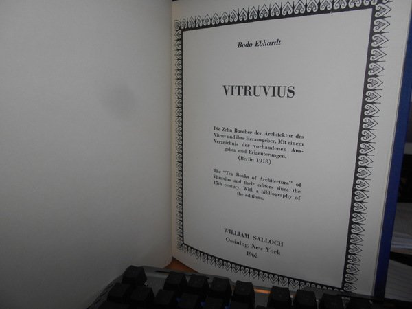 BODO EBHARDT. New York, William Salloch, 1962. VITRUVIUS. Die Zehn Buecher der Architektur des Vitruv und ihre Herausgeber. Mit einem Verzeichnis der vorhandenen Ausgaben und Erlaeuterungen. (Berlin 1918). In-8° grande, tela bleu con titolo in oro al dorso. 101, (1) pp. con numerose illustrazione nel testo. Come nuovo. Uff. E - V - 6