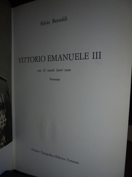 VITTORIO EMANUELE III di Silvio Bertoldi. Torino, UTET., 1971. In-8°, tela e oro con sovracopertina. xii, 492 pp. con 31 tavole fuori testo. In ottimo stato di conservazione. Neg. esot. mob. 13.
