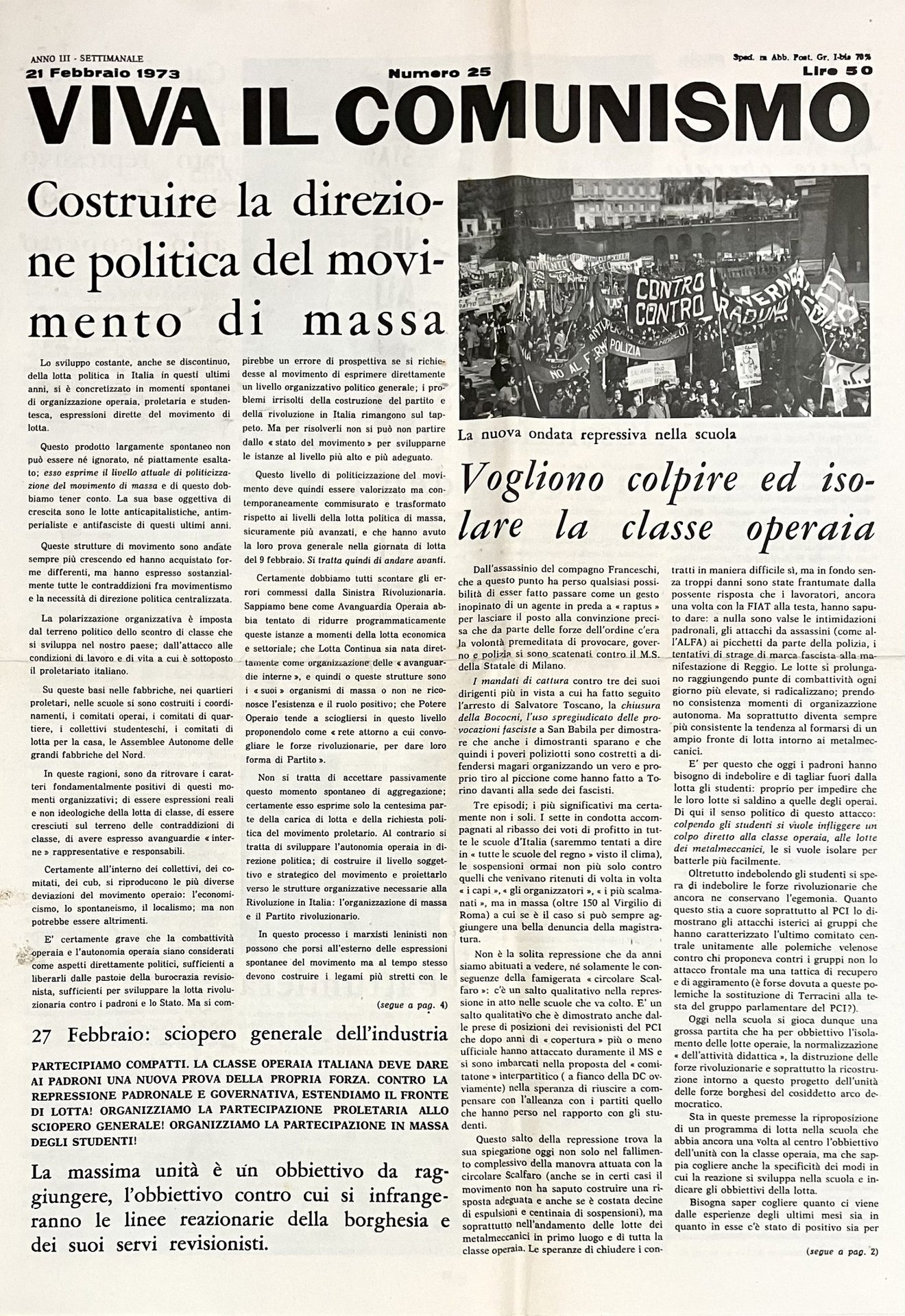 Viva il comunismo. Anno III Numero 25. 21 Febbraio 1973