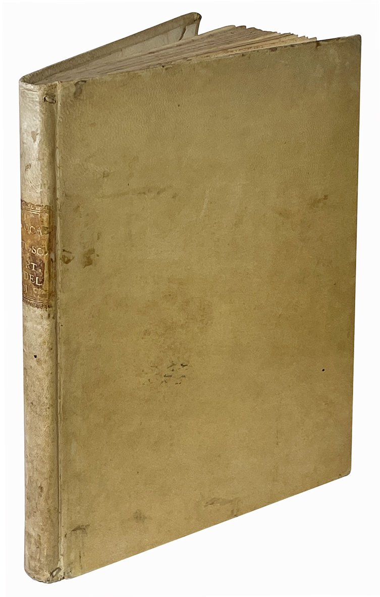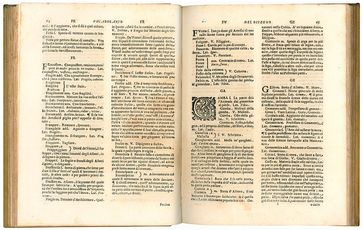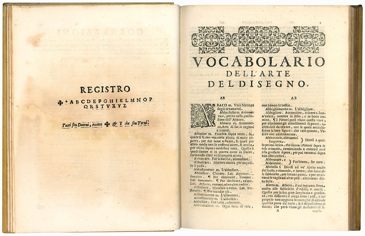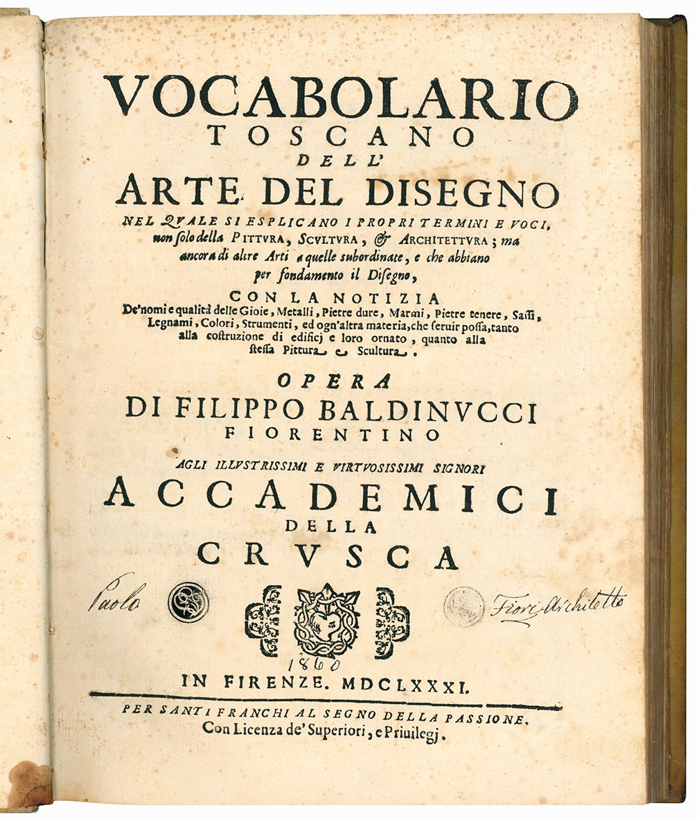 In 4to (mm 256x193); pp. XIX, [1], 188. Segnatura: ?6 *4 A-X4 Y6 Z4. Titolo all'occhietto: Vocabolario toscano dell'arte del disegno. Piccolo fregio xilografico al frontespizio; iniziali, frontalini e fregi xilografici. Testo stampato su due colonne. Fioriture ed aloni diffusi, alcune carte brunite. Piena pergamena coeva con titolo in oro su tassello al dorso. Timbro all'occhietto e al frontespizio, timbro a secco all'occhietto. Nota di possesso manoscritta al margine inferiore del frontespizio (“Paolo Fiori Architetto”). Buon esemplare.
