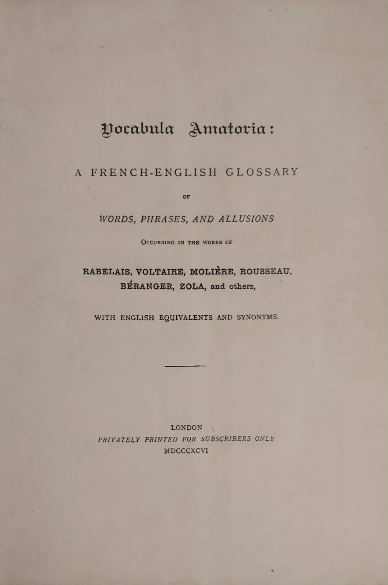 VOCABULA AMATORIA. A french-english glossary of words, phrases, and allusions occurring in the works of Rabelais, Voltaire, Molière, Rousseau, Béranger, Zola, and others. With english equivalents and synonyms.