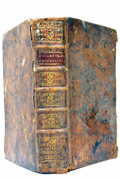 XIJ. 696 pages. (17x11 Cm). Plein veau de l'époque. Dos à nerfs orné. Pièce de titre de maroquin rouge. Tranches rouges. Manque de cuir sur les deux plats. Accident sur la coiffe supèrieure. Coins très émoussés. Premiers feuillets blancs et page de titre salis. Les deux feuillets blancs au debur partiellement dereliés. Intèrieur en bon état à part quelques mouillures lègeres sur les premières et les dernières pages. Dictionnaire imprimé en deux colonnes.