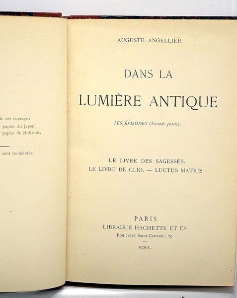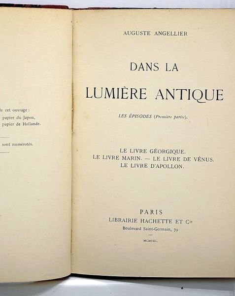 Volume I: Dans la lumière antique. Les épisodes (Première partie). Le livre géorgique. Le livre marin. Le vivre de Vénus. Le livre d'Apollon. Volume II: Dans la lumière antique. Les épisodes (Seconde partie). Le livre des sagesses. Le livre de Clio.-Luctus Matris.