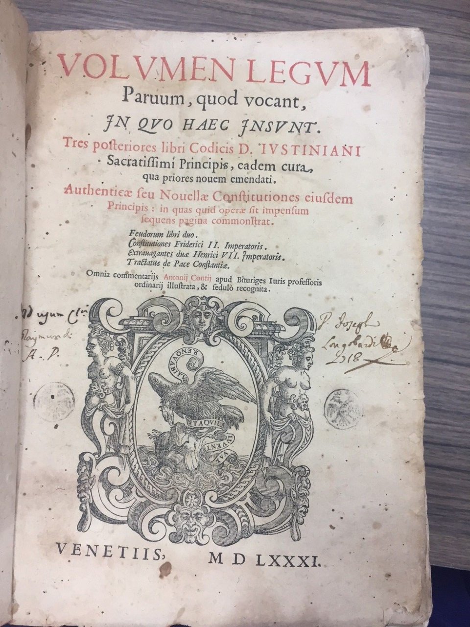 Tres posteriores libri Codicis D. Iustiniani Sacratissimi Principis, cadem cura, qua priores Principis, cadem cura, qua priores nouem emendati. Authemticae seu Nouellae Constituiones Eiusdem. Principis: in quas quid operae sit impensum sequens pagina commonltrat. Fendorum Libri duo. Constitunes Friderici II. Imperatoris. Estranagantes due Henrici VIII Imperatoris. Tractatus de Pace Constantiae. Omnia conmmentarijs Antonij Contij apud Bituriges Iuris professoris ordinari illustrata e fedulò recognita. Venetia 1581, 8°, pp. 20nn.359+226+145. Unito: Institutionum sive Primorum totis Iurisprudentiae elementorum. Libri quatuor. Dn. Iustiniani sagratissimi. Principis authoritate iussuq compositi. Commentariis Accursii & multorum insuper aliorum doctorum hominum scholiis atque obseruationibus illustrati. Non sine locupletissimo ciom verborum tum rerum indice. Accessit ipsius Iustiniani Imperatoris vita, ex variis auctoribus opera Aegedii Perrini Fori Ecclesiastici Iosaiensis. Venetiis 1581, pp. 38+384. Belle marche tipografiche ai frontespizi, capilettere e finalini finemente incisi, frontespizi e testo a due colori (nero e rosso). Tagli in rosso. Bruniture e alcune annotazioni marginali di studio coeva ad alcune pagine del testo che non ledono la leggibilità del testo. Mancanze marginali alle prime 72 pagine che lede il margine bianco ma non il testo che è leggibile. Leg. in piena pergamena coeva ma sciupata, con pezzo di pergamena sempre coevo applicato al dorso e mancanze marginali. Alcune pagine semistaccate dal testo. Bruniture sparse. Sciupato.
