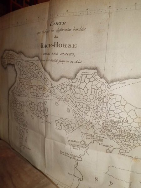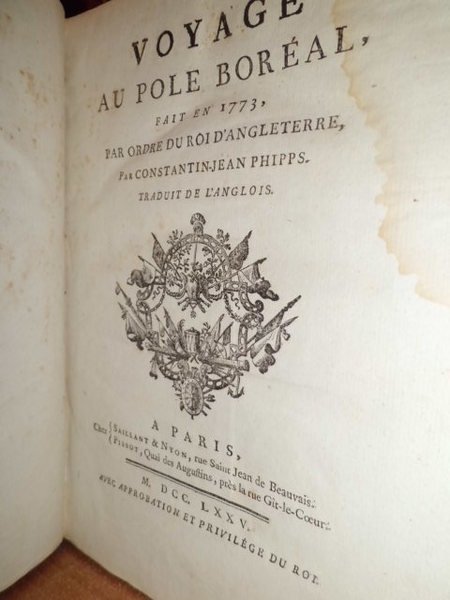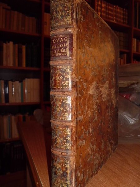 Voyage au Pole Boréal, fait en 1773, par ordre du Roi d' Angleterre, par Constantin - Jean Phipps. Traduit de l' anglois. Paris, chez Saillant & Nyon - Pissot, 1775. Prima edizione. In - 4°, piena pelle coeva, dorso a 5 nervi con fregi floreali e filetti in oro sui piani. xii, 259, (3) pp. e 12 tavole incise in rame da De la Gardette ripiegate f.t. comprendenti 3 carte geografiche, 4 vedute di paesaggi polari e varie figure di animali, strumenti nautici e macchine idrauliche. Boucher de la Riharderie, I, pp. 374 - 75. Chavanne, Liter. uber d. Polar - Regionen, 1943. Cox, II, p. 19: << This expedition was undertaken for the purpose of discovering a route to India through the Polar Regions. North of Spitzbergen the sea was absolutely blocked with the ice and the vessels had to return. It made an important addition to the science of navigation and to the knowledge of the natural productions of Spitzbergen. >>